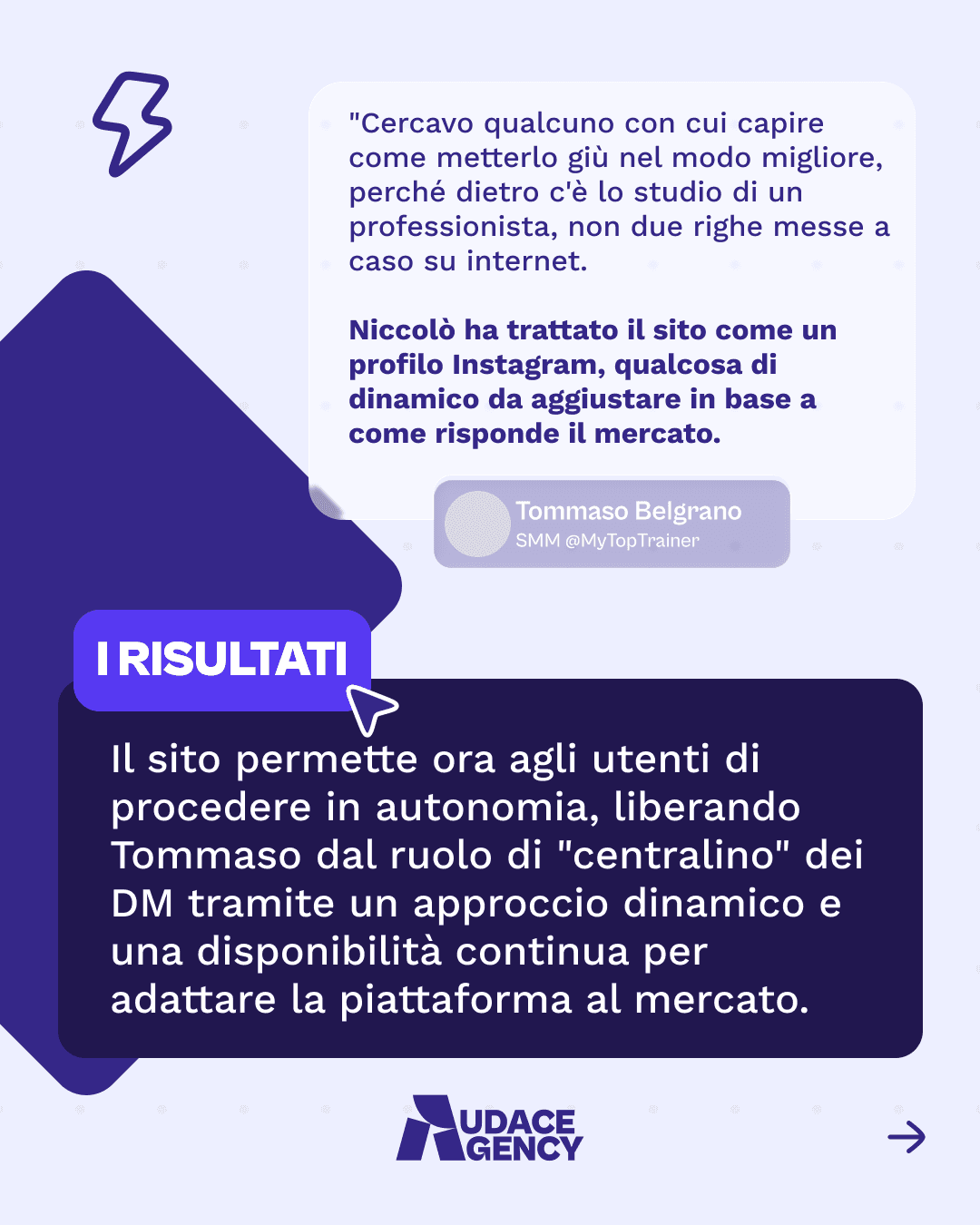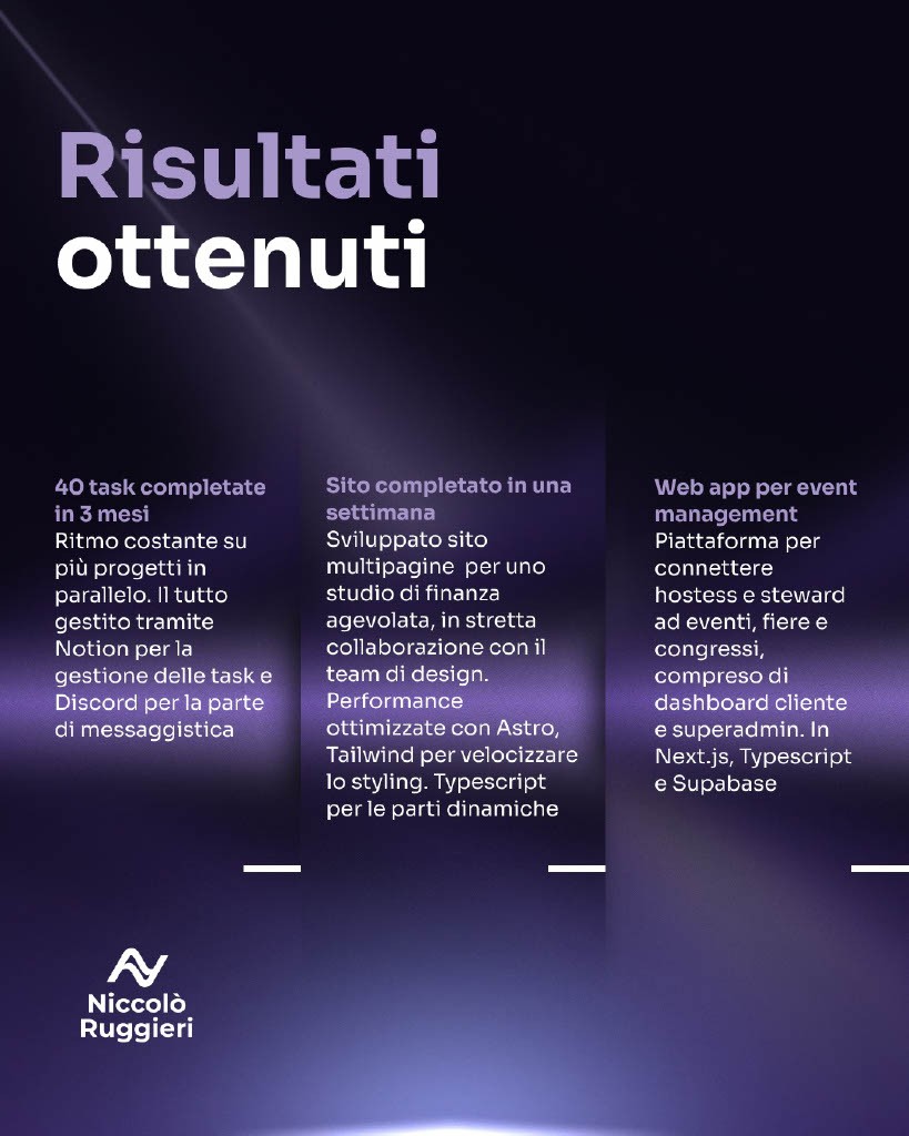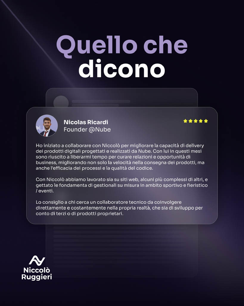When Niccolò came to me, he had a clear problem: no coherent visual identity for social media, and no easy way to manage it on his own. I took his agency's webpage as a starting point and built a system of social templates: consistent, on-brand, and simple enough for anyone to edit.